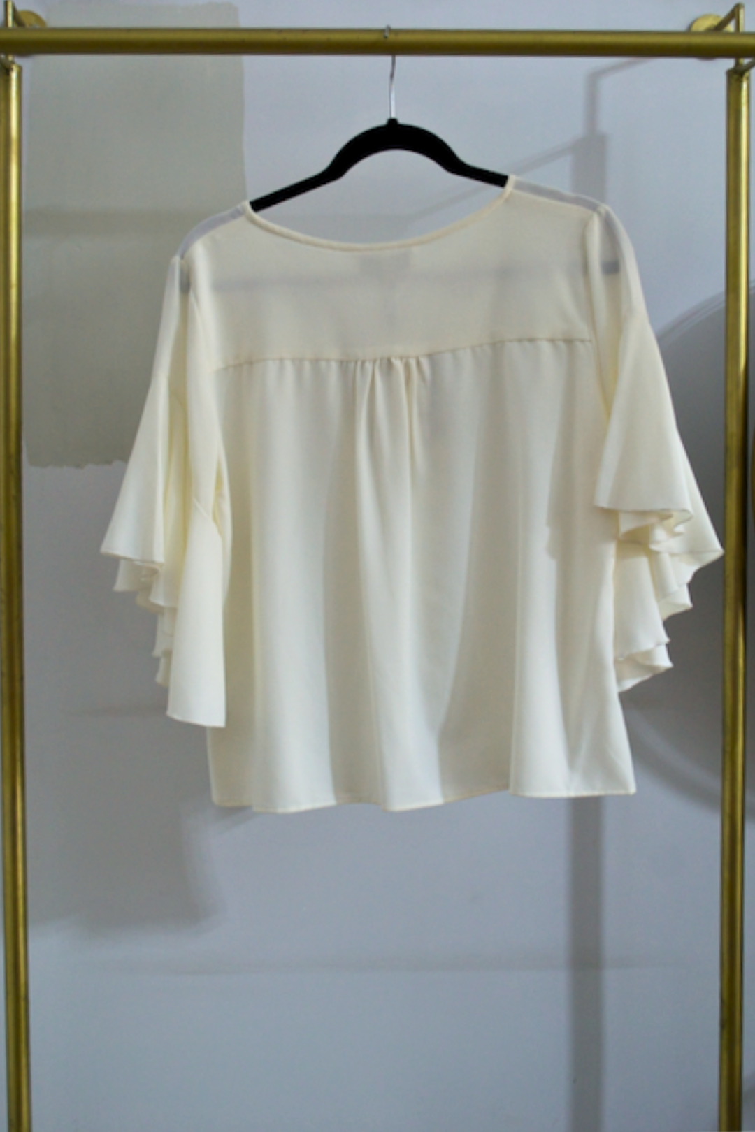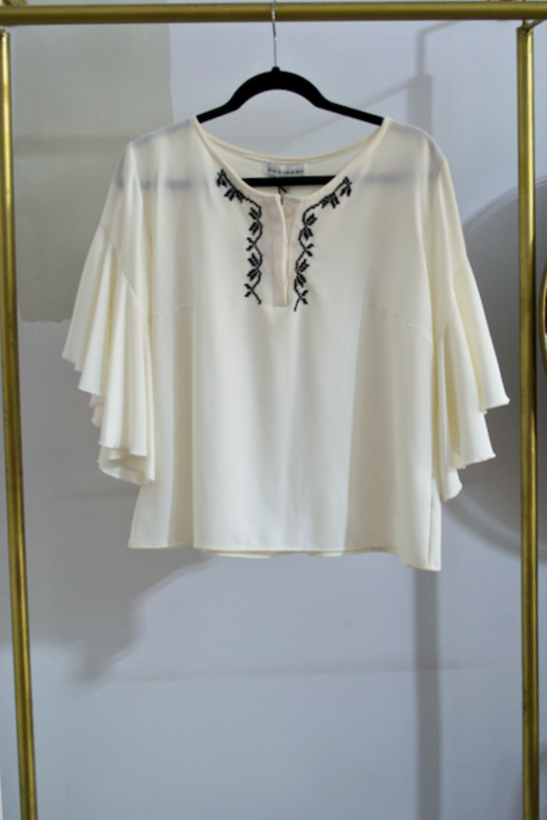 Blusa cuello U, con botones y bordado artesanal decorativo.
