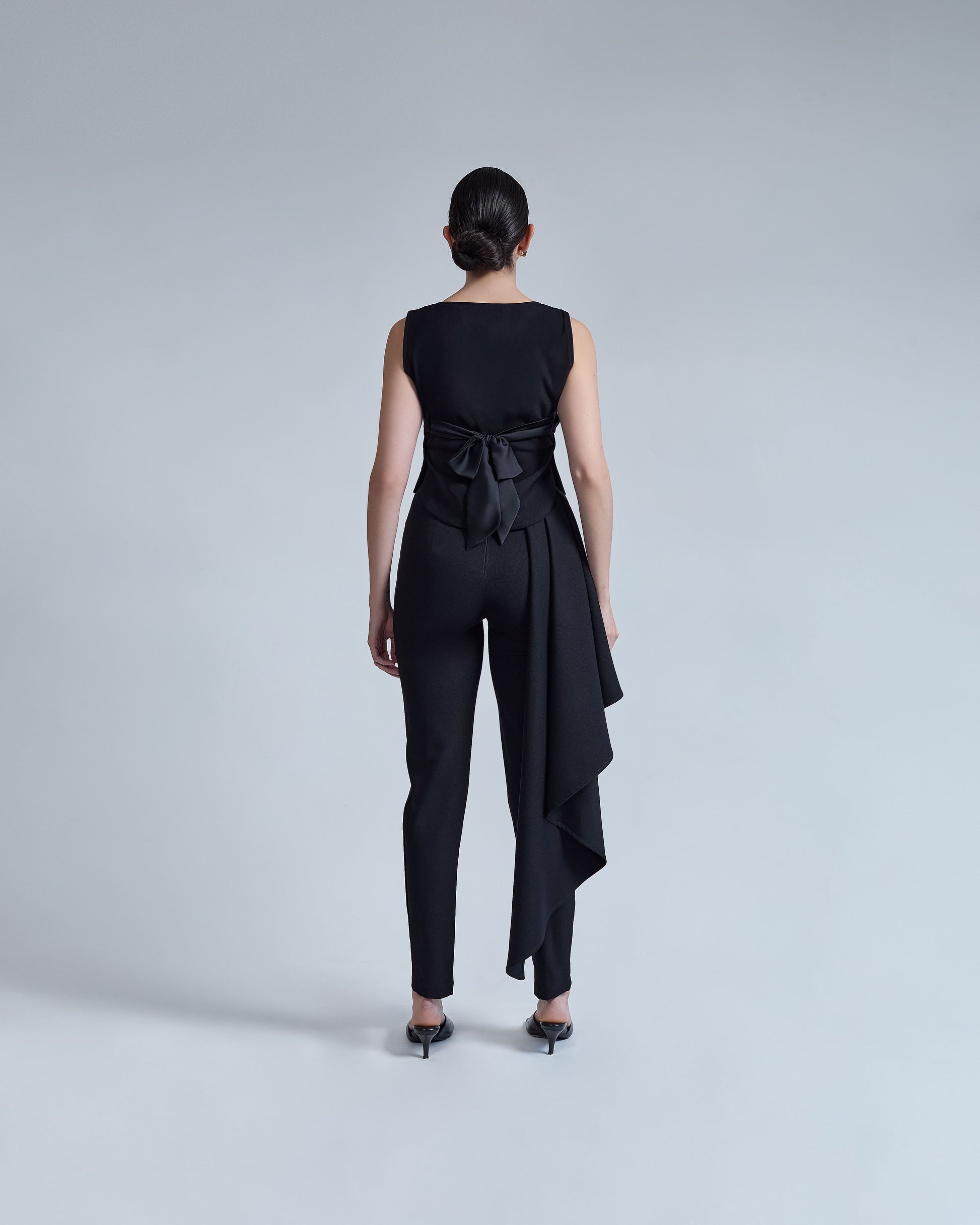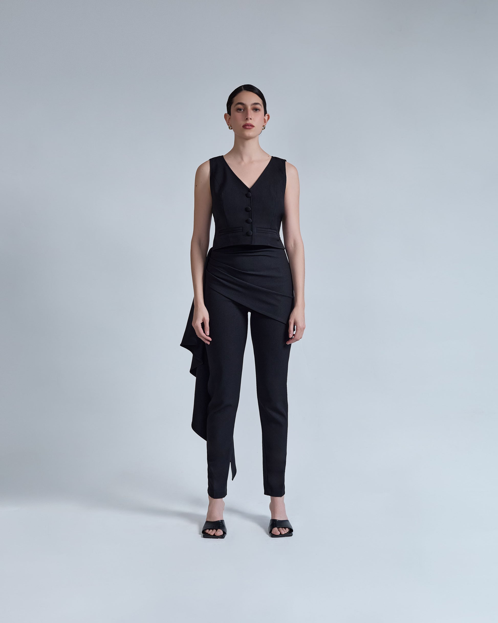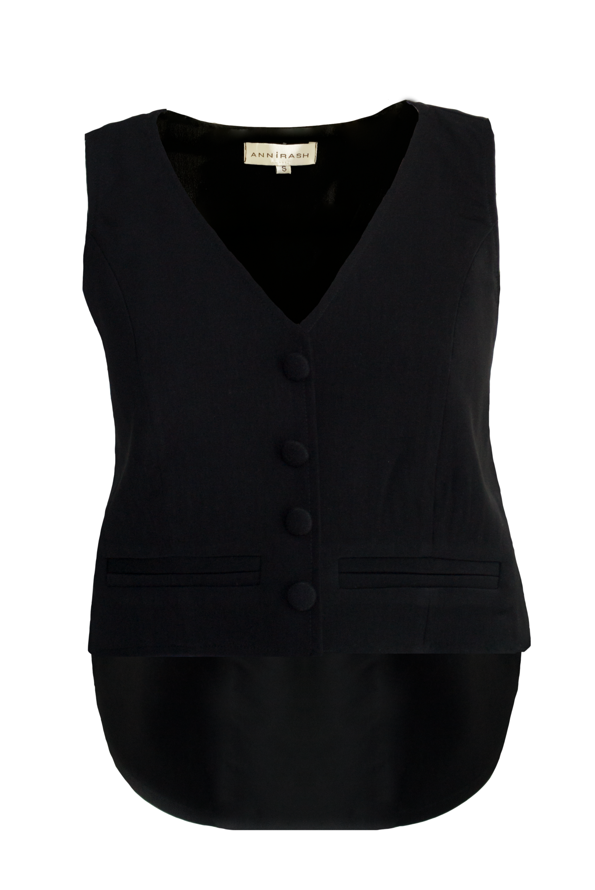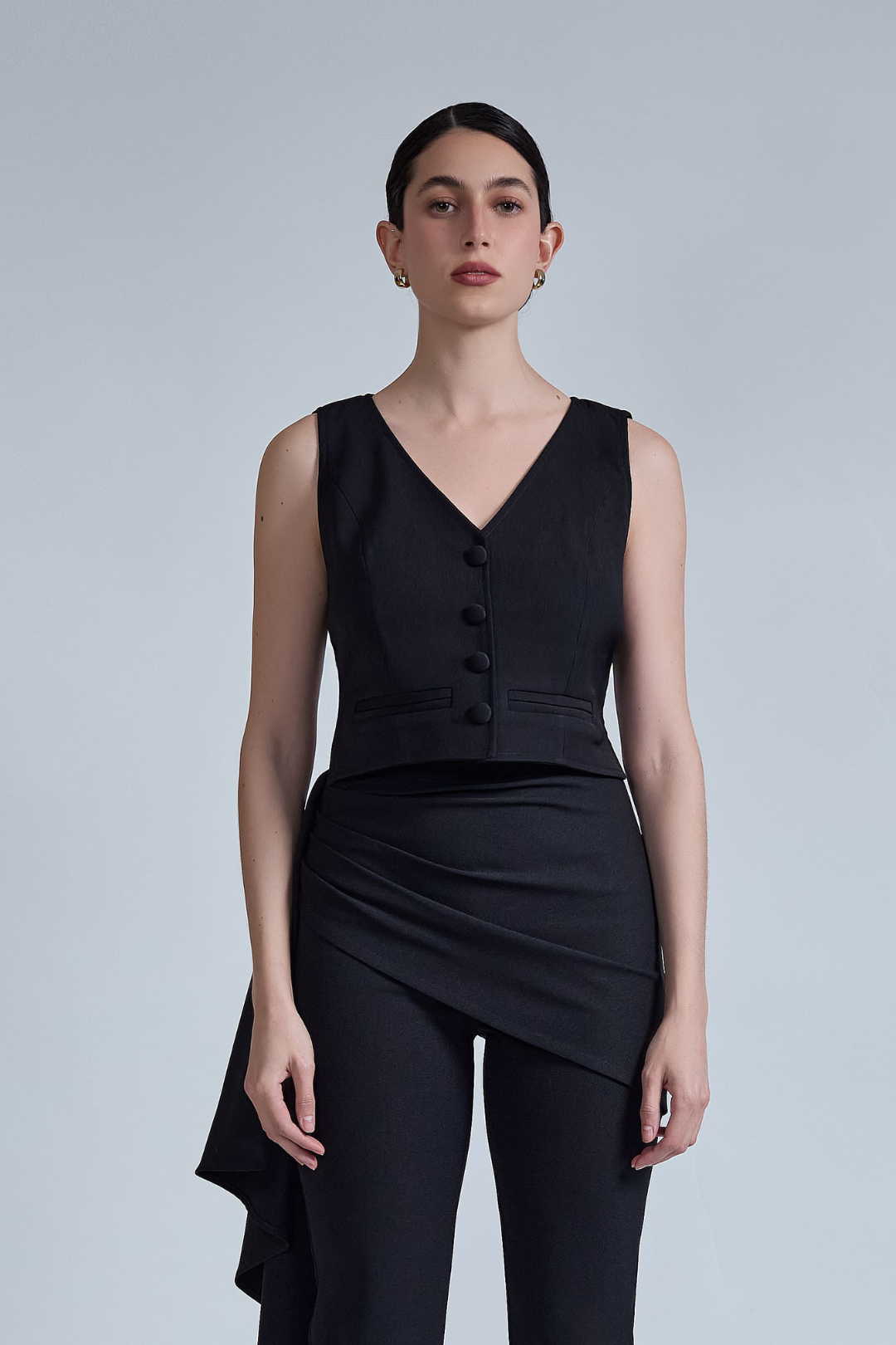 Chaleco con detalle de botones y bolsas simuladas, abertura en los costados y fajo de tela que cierra por la parte trasera