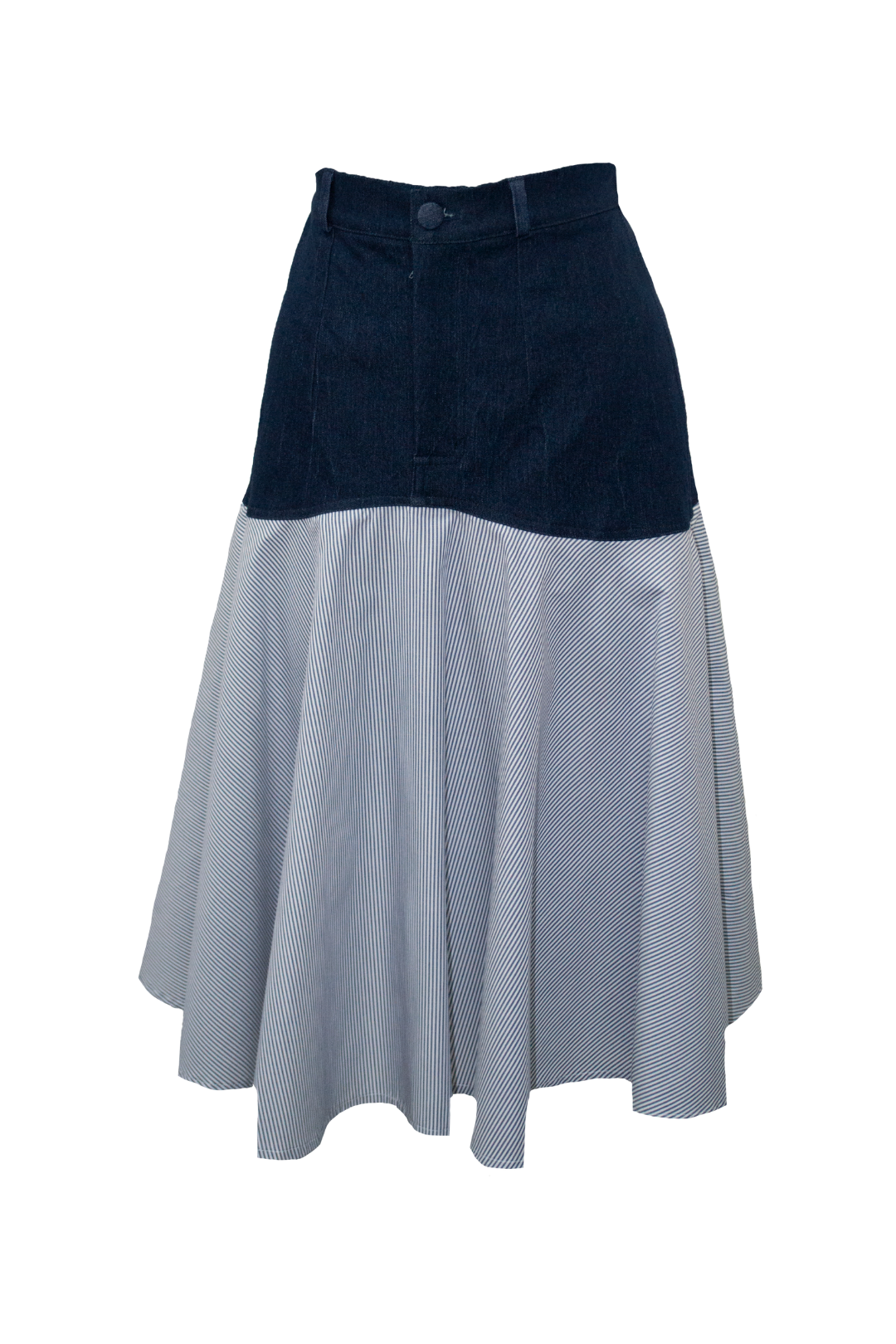 Falda midi con cintura en denim azul oscuro y vuelo en tejido a rayas finas.
