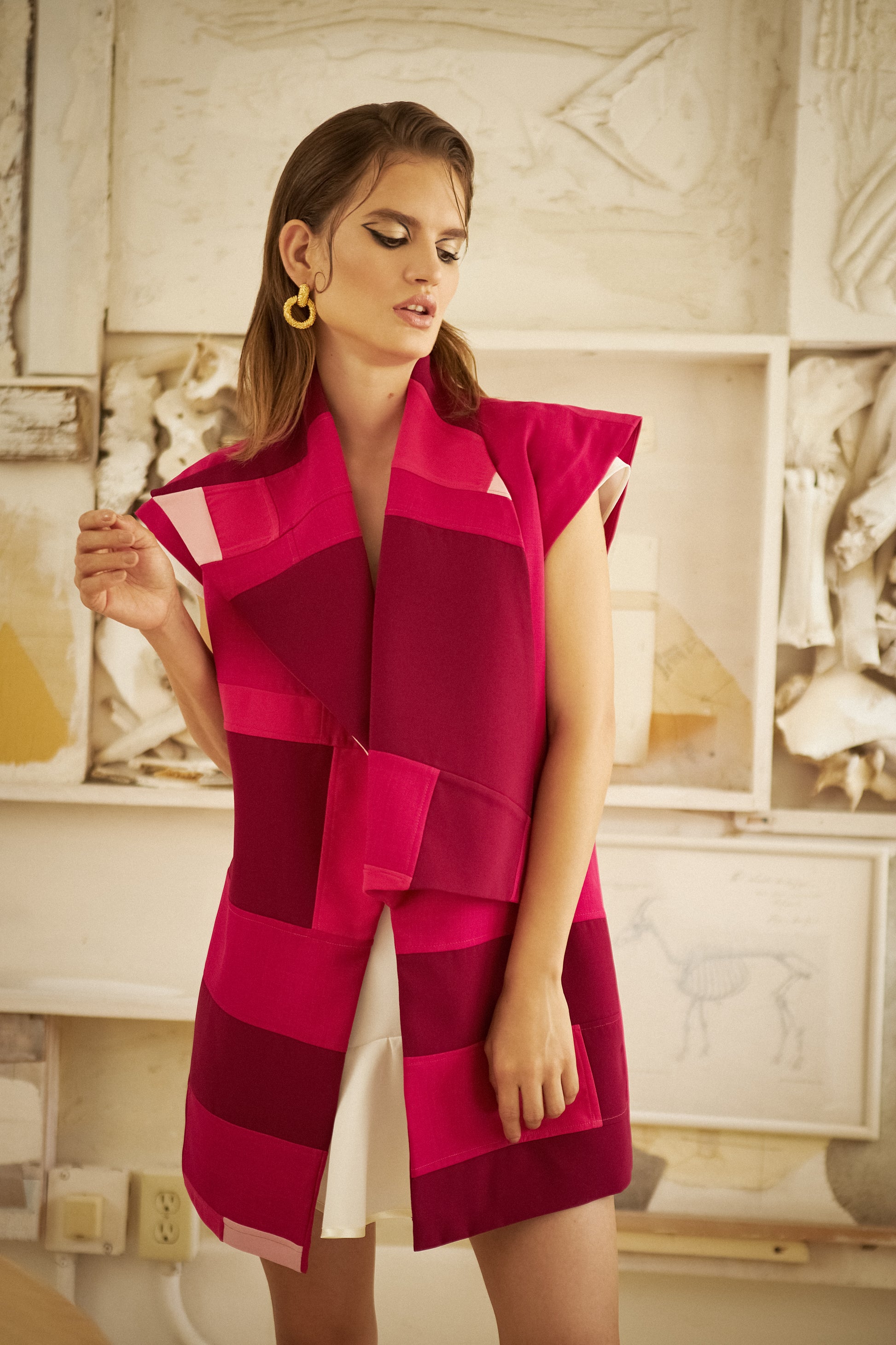 Saco realizado con retazos de tela asimétrico, bolsas ocultas.