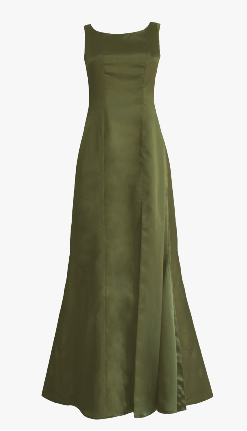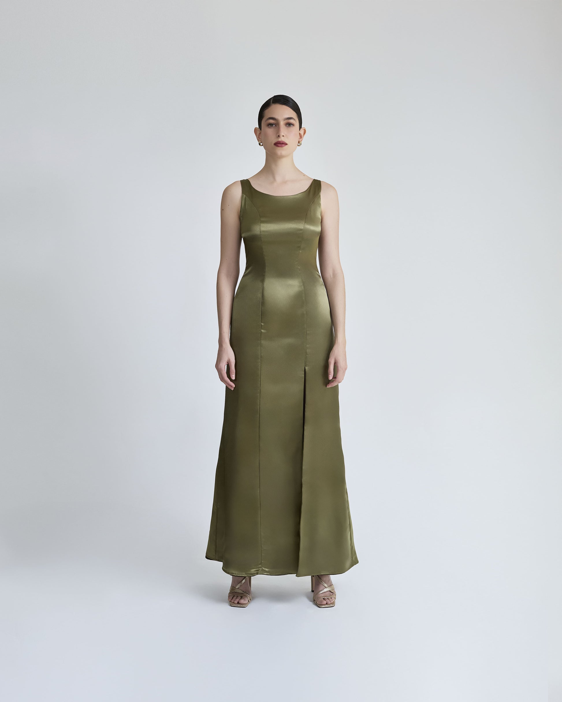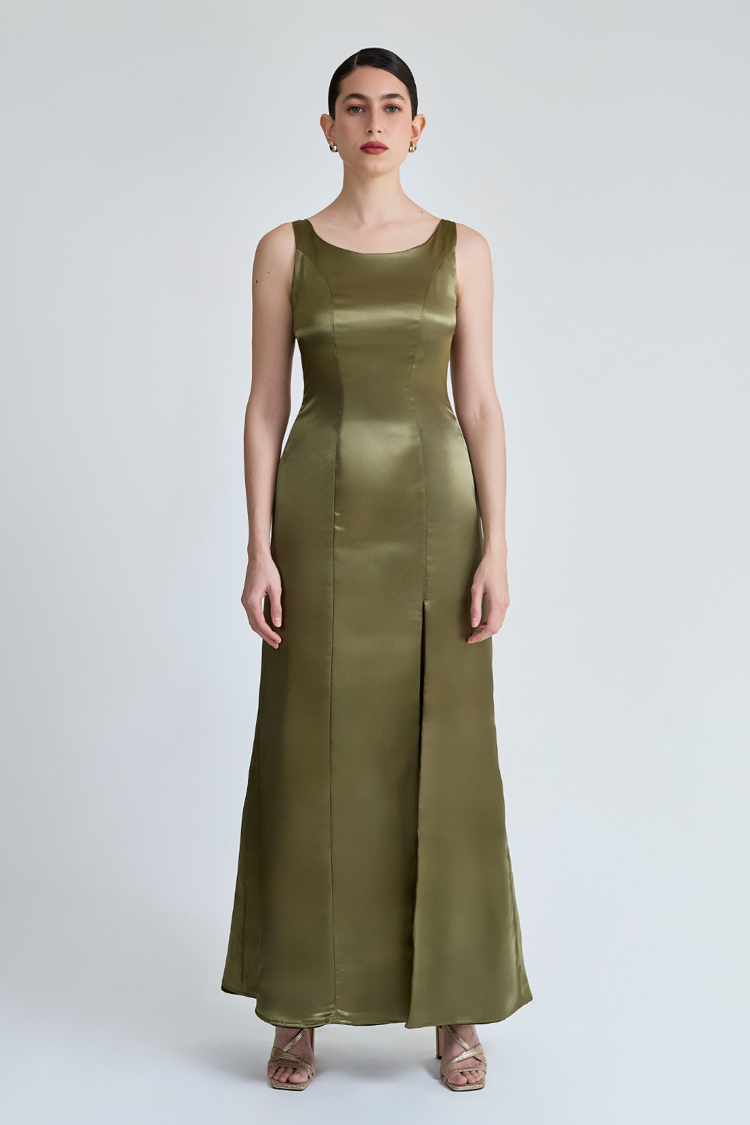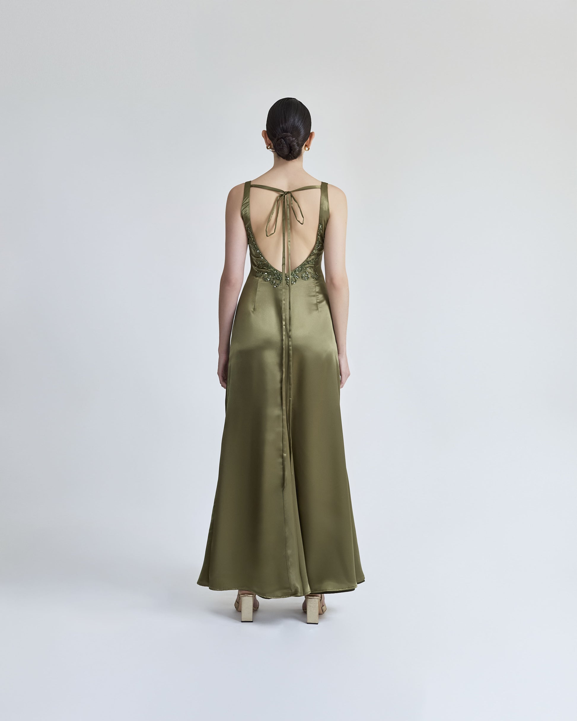 Vestido en cuello redondo en forma A con una abertura en la pierna, escote profundo con detalles bordados y listón en la parte trasera