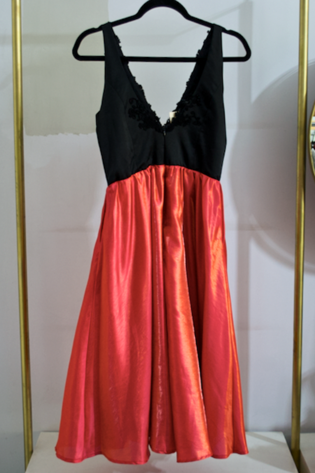 Escote pronunciado V con bordado en parte delantera y trasera (cierre invisible) y falda circular.